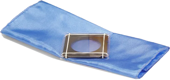 A coin is sandwiched inside a clear case, locked inside with 4 rubber bands and wrapped up in a small scarf.