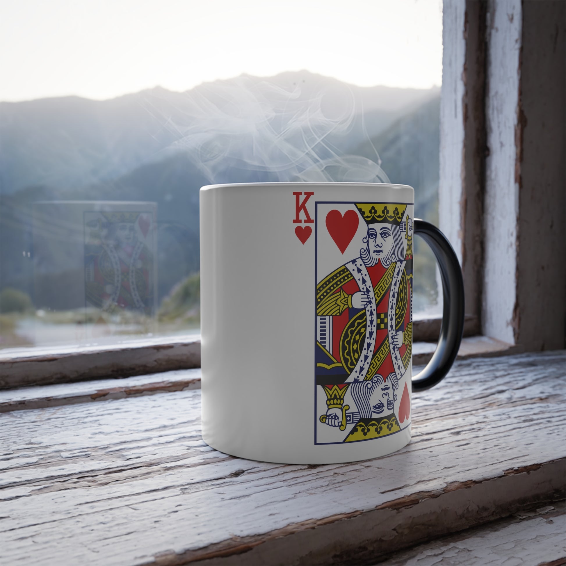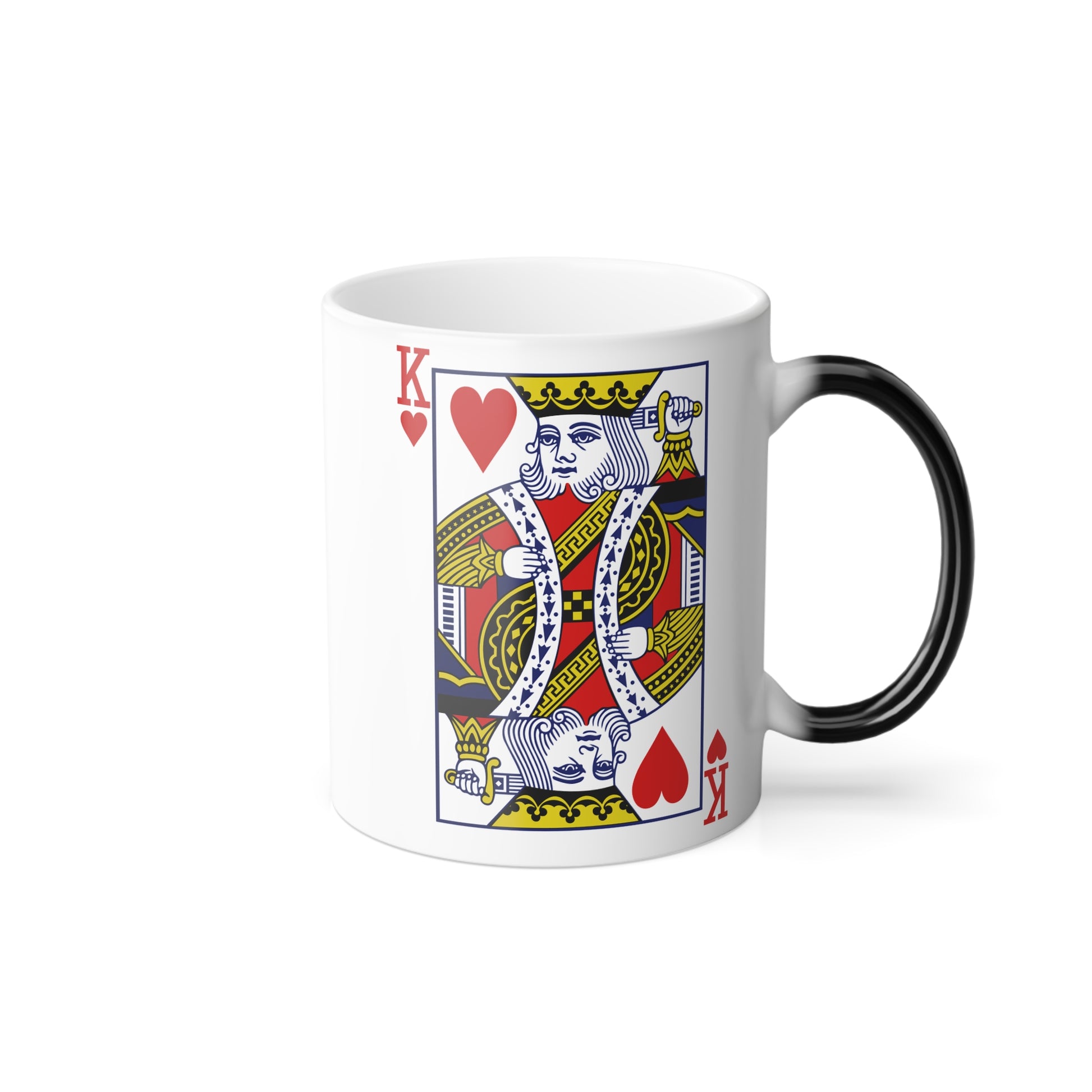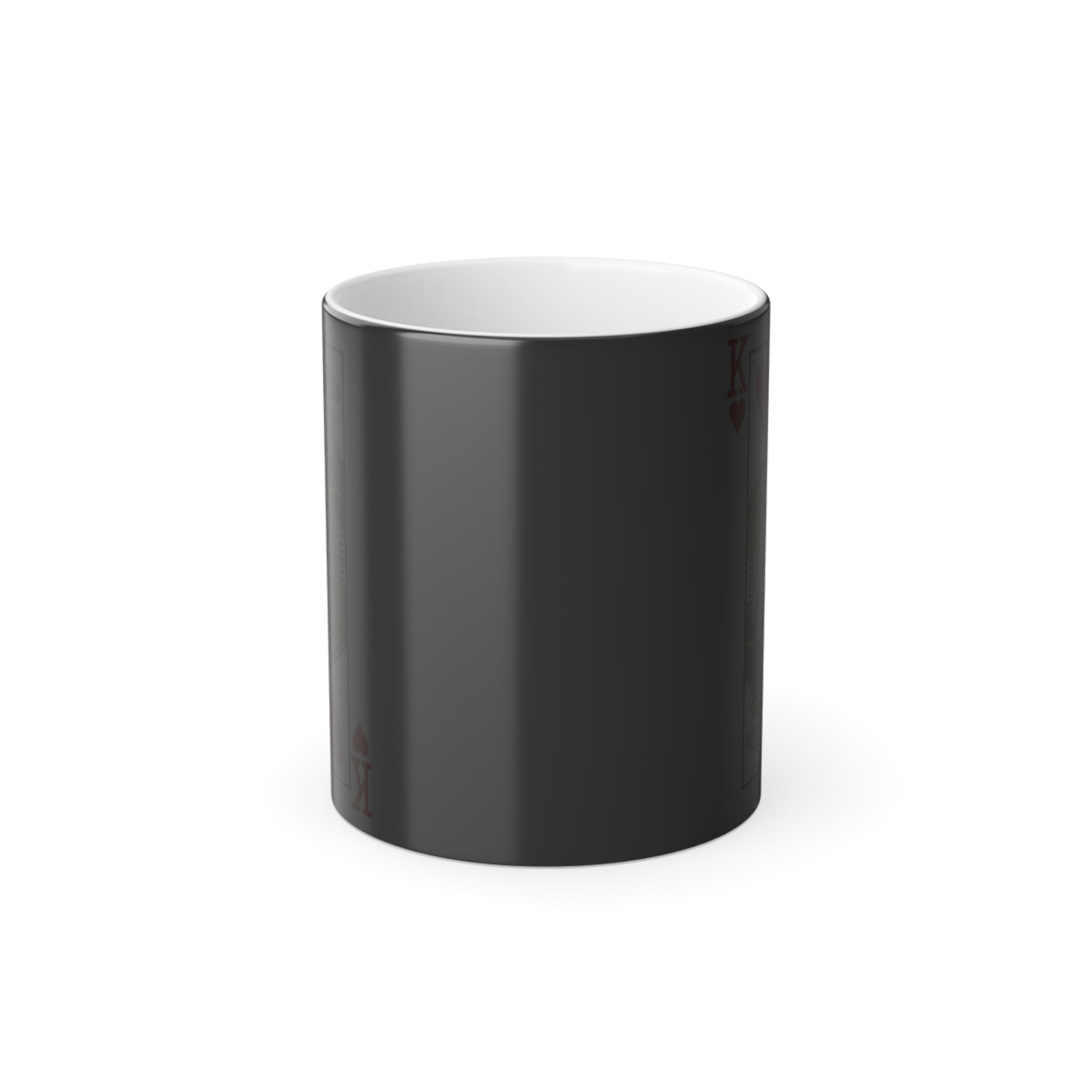 This Magic Mug changes color and reveals your spectator's chosen card (King of Hearts*). The heat-reactive surface reveals the image once the mug gets warm. When the mug is cold, it is solid black. But pour a warm liquid (coffee, tea, cocoa, etc) into the mug and the image will mysteriously appear. It returns back to its original black outside and white inside when it cools down. The C-shaped handle helps keep a sturdy grip. 11oz (0.33l) – plenty for that big morning cup of coffee.