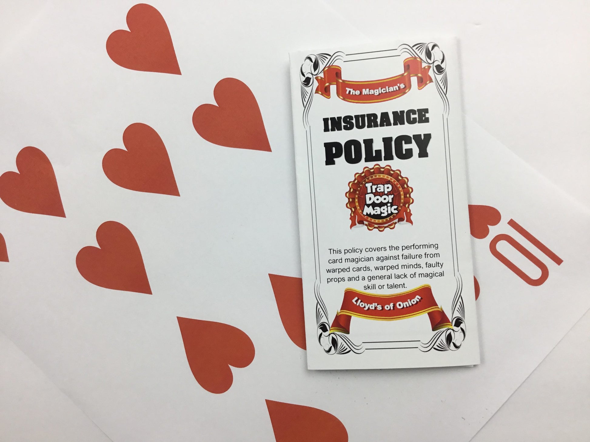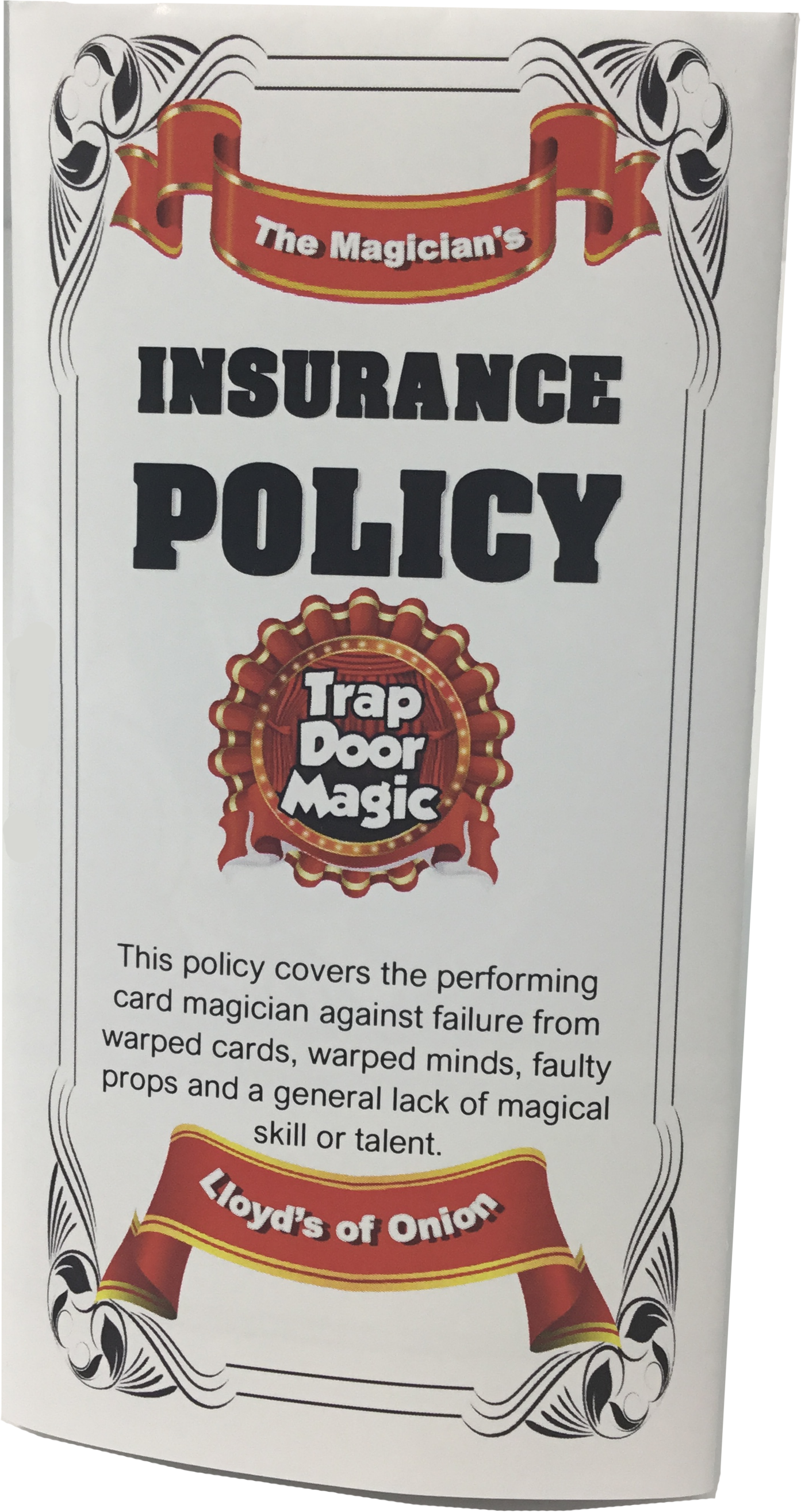 It looks like the magician has made a mistake and can't find the selected card! Good thing the magi has insurance. Upon opening the policy, the spectator's chosen card appears in full color on the giant page.