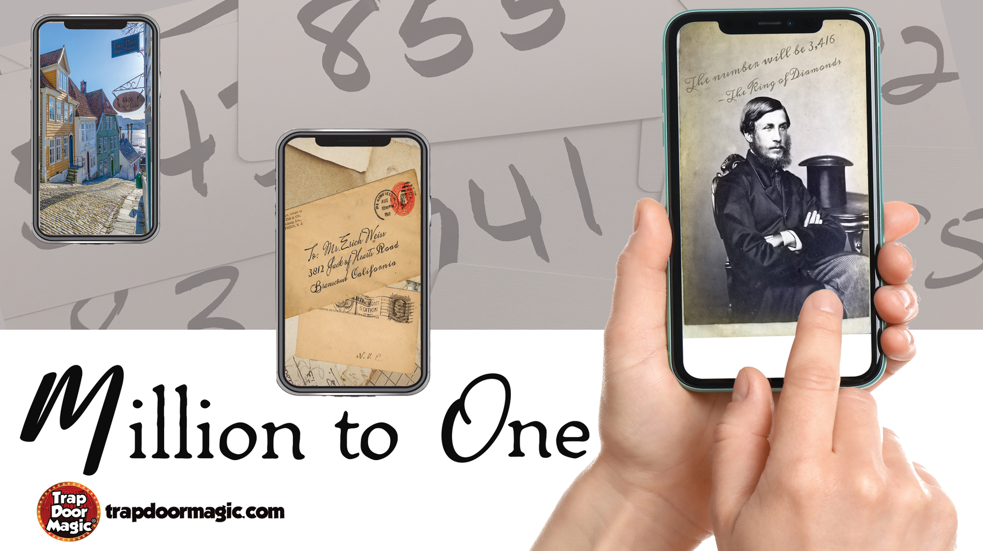 EFFECT: The magician shows an antique picture from the 1800's depicting his "great-grandfather" sitting by a table with a top hat who was also once a magician. To prove his ancestors magical skills, the performer has his audience select 5 random numbers from a stack of cards with various 3 digit numbers hand written on them. Their freely selected total is a 4 digit number that somehow magically appears in the antique photo - the audience's freely selected number is written on the wall by the old magician in the photo!